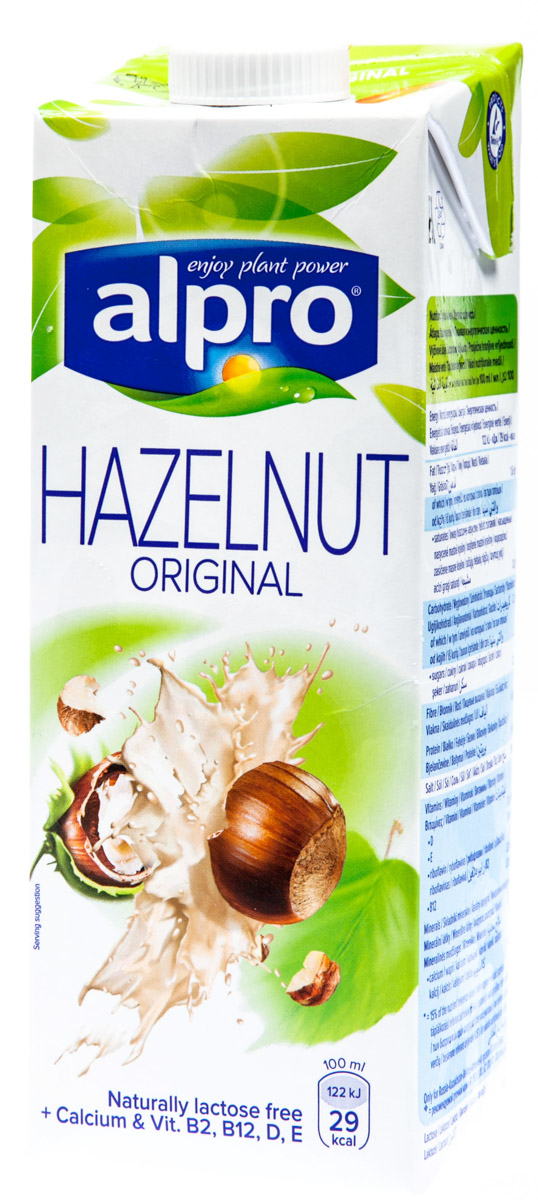 - Alpro nápoj ochucený lískovými ořechy, zdroj vápníku a vitaminů, bez lepku, zdroj vitaminu B12, s nízkým obsahem nasycených tuků, přirozeně bez laktózy